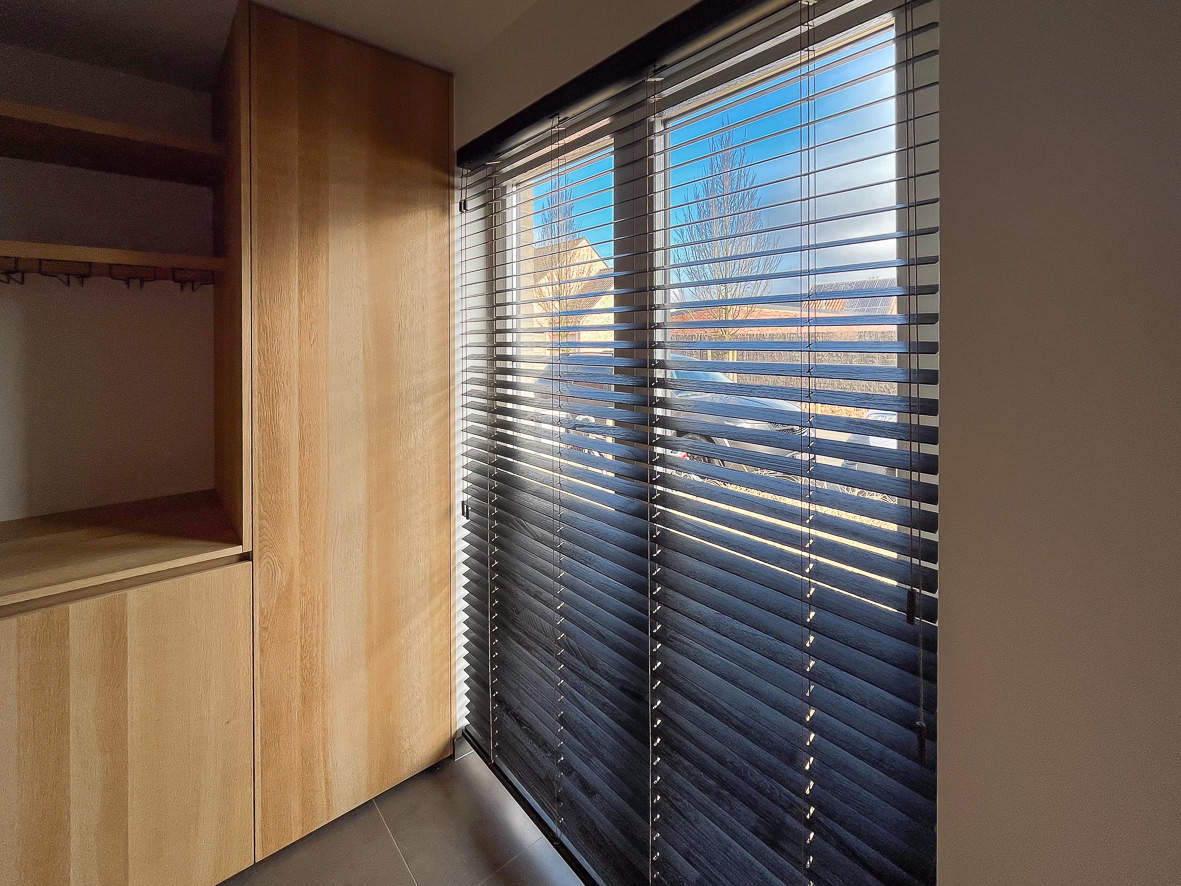 Houten jaloezie gecombineerd met inbetween gordijn